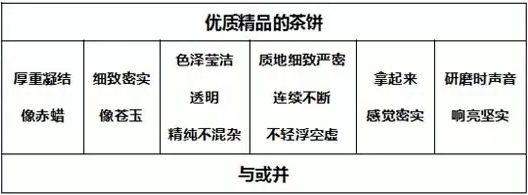 有的茶餅表面光彩而內(nèi)在灰暗,也有的茶餅內(nèi)里實(shí)在潔凈而外表質(zhì)樸。茶餅外表如同人的容貌各不相同,很難一概而論??偠灾?,色澤瑩潔透明并且顏色不混雜,質(zhì)地細(xì)致嚴(yán)密而不輕浮,拿起來(lái)感覺(jué)密實(shí),碾碎時(shí)聲音清亮,這些都可以表明是精品好茶。茶葉的鑒別,有的可以通過(guò)具體的言語(yǔ)和意旨來(lái)表達(dá),有的只能心中領(lǐng)會(huì)了。