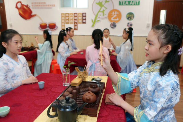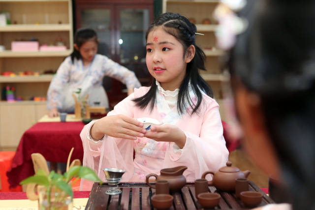 日前,天津市和平區(qū)哈密道小學(xué)舉行“以華服之美,致敬茶事之道”校園茶藝展示活動,組織學(xué)生們進行茶服和茶藝展示,在校園里弘揚傳統(tǒng)文化。