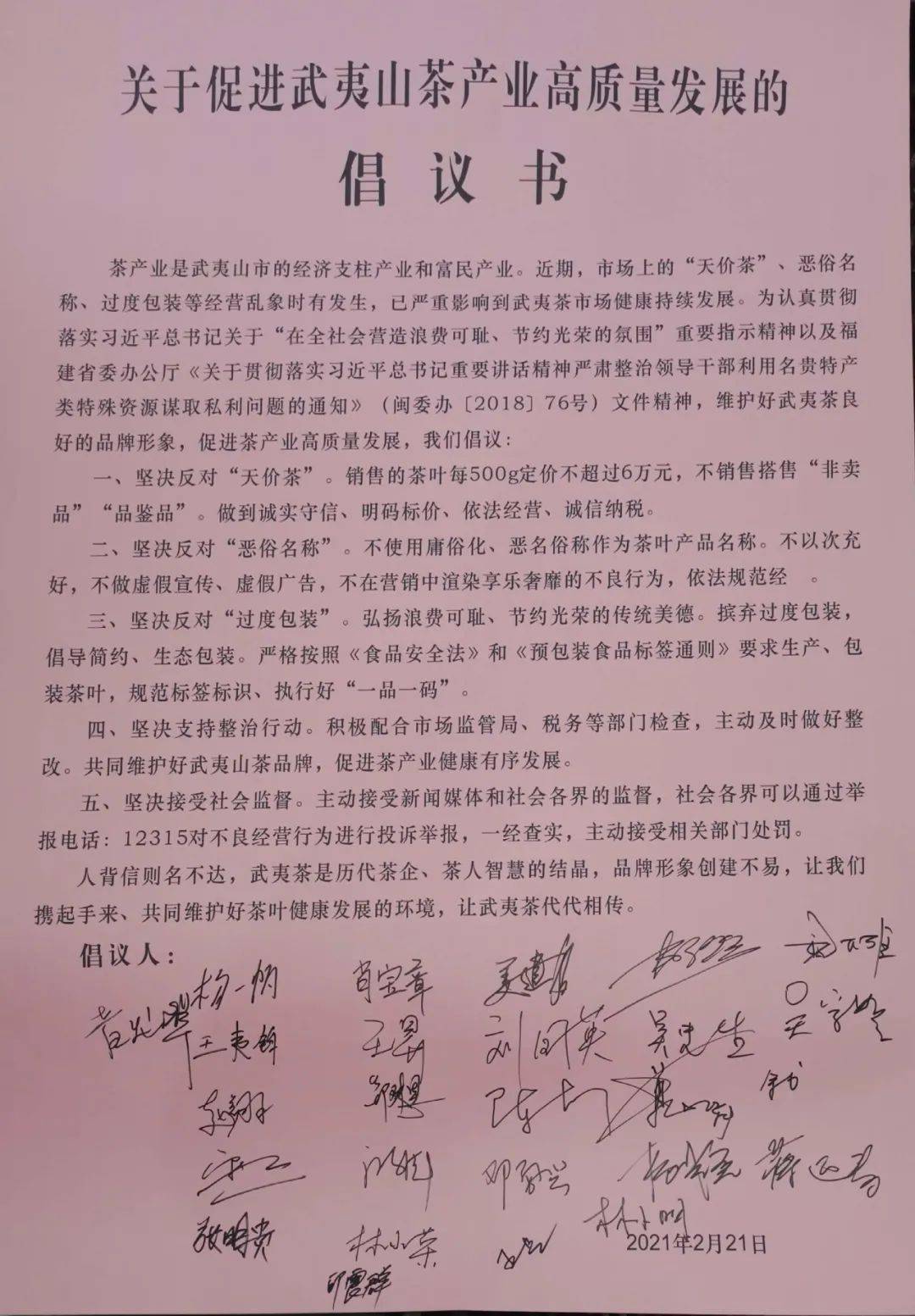 2月21日下午,武夷山市召開促進茶葉市場健康發(fā)展推進會,26家曾出現(xiàn)在網(wǎng)傳“天價茶”榜單上的武夷山茶企負責(zé)人共同簽署《關(guān)于促進武夷山茶產(chǎn)業(yè)高質(zhì)量發(fā)展的倡議書》,堅決反對“天價茶”,堅決反對“惡俗名稱”、“過度包裝”,承諾不做虛假宣傳,規(guī)范經(jīng)營管理,不銷售“非賣品”“品鑒品”,自覺接受監(jiān)督,如有違法違規(guī)行為,一經(jīng)查實,主動接受相關(guān)部門處罰。