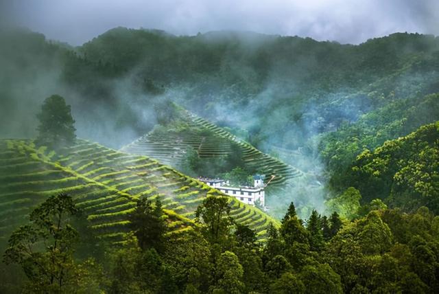 合水鎮(zhèn)鐵山茶場漫山遍野的茶樹沿著梯田整齊排列,煥發(fā)著勃勃生機 高訊攝