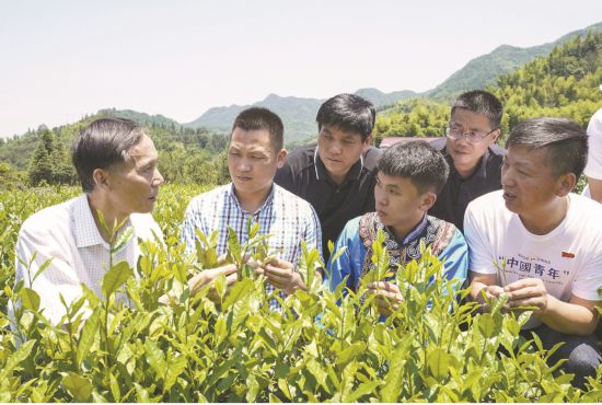 省級非遺傳承人李賢葆(左一)向朱遠(yuǎn)志(左四)講授舒城小蘭花茶葉的種植、管理技術(shù)。張永攝