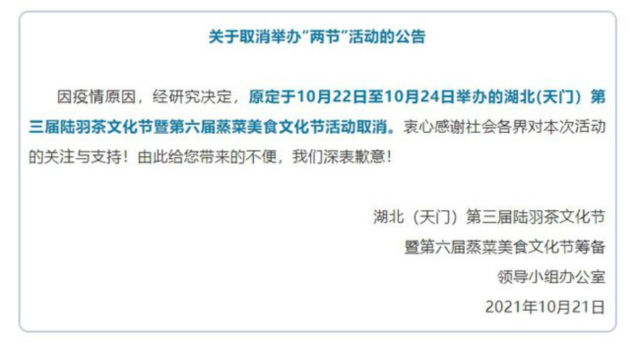 據(jù)湖北(天門)第三屆陸羽茶文化節(jié)暨第六屆蒸菜美食文化節(jié)籌備領(lǐng)導(dǎo)小組辦公室最新公告,因疫情原因,經(jīng)研究決定,原定于10月22日至10月24日舉辦的湖北(天門)第三屆陸羽茶文化節(jié)暨第六屆蒸菜美食文化節(jié)活動(dòng)取消。