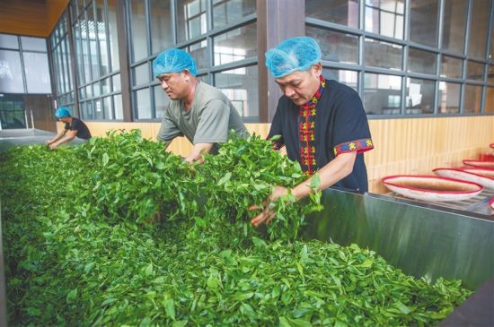 7月17日,在五指山市水滿鄉(xiāng),當地村民將茶青均勻攤鋪在萎凋床上