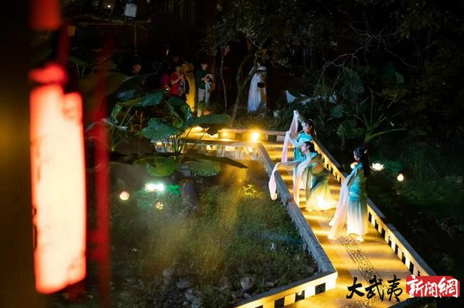 中秋之夜,月滿情濃。武夷山宋街景區(qū)內(nèi),流光溢彩,人流如織。吃茶、聽曲、猜燈謎......伴隨著古街內(nèi)的典雅的古琴聲“宋風當潮 · 武夷月夕”活動擺茶開席,歌舞秀+民俗表演,將歷史上武夷山中秋夜民間祭月的場景予以復原,讓現(xiàn)場游人穿越時空,感受傳統(tǒng)中秋的賞月民俗。